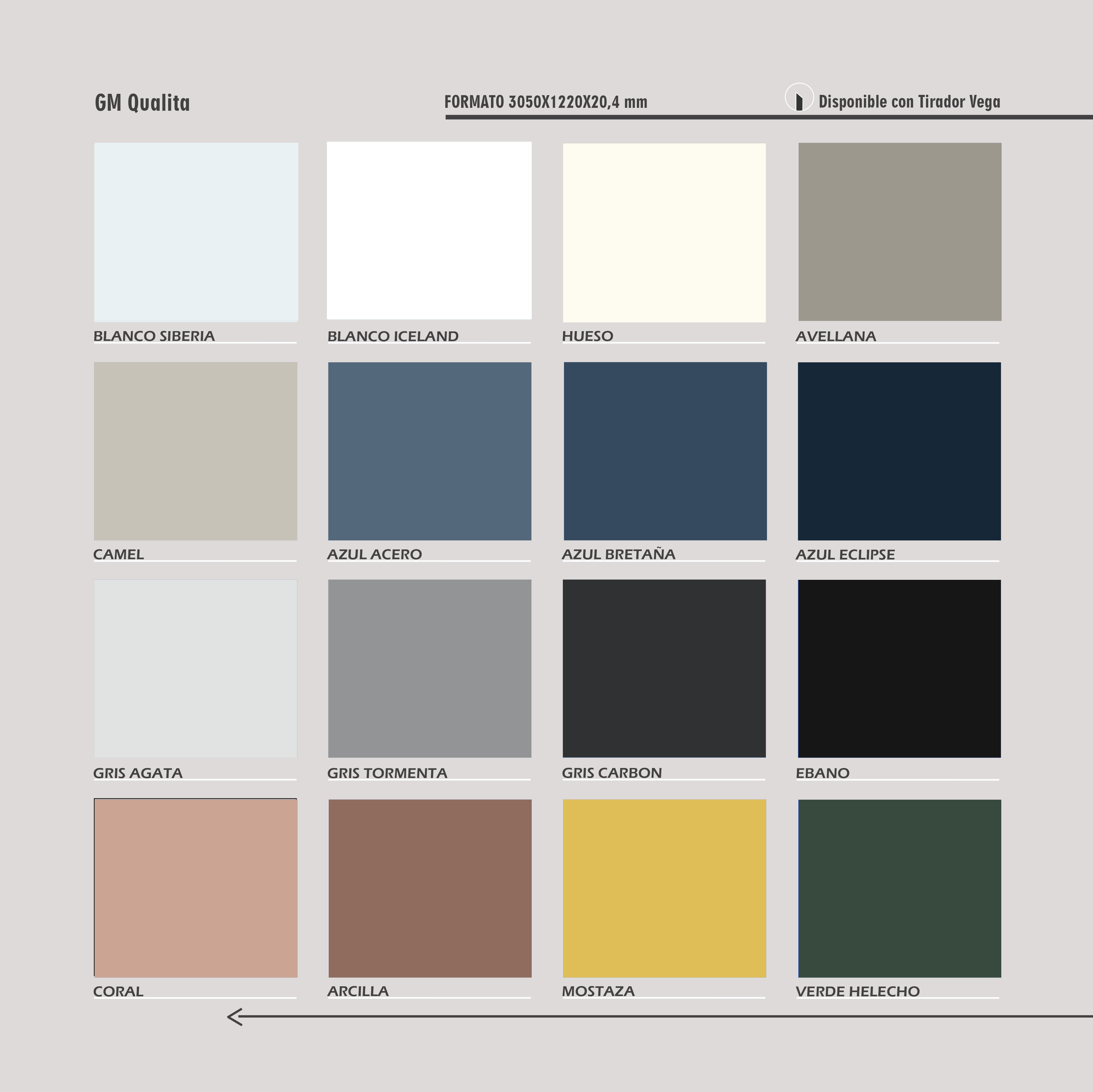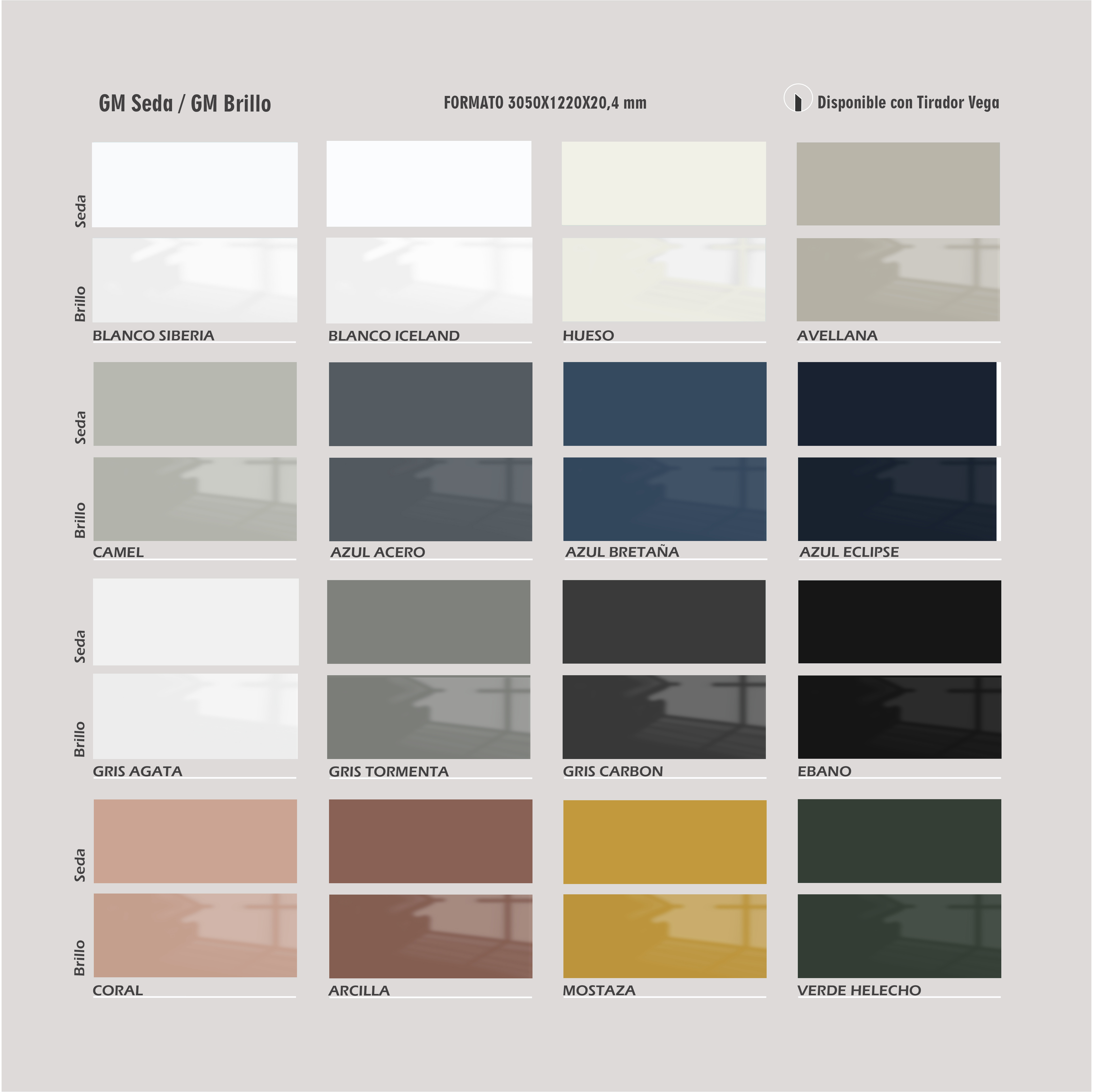 Ambas líneas, GM Brillo y GM Seda, se presentan con los mismos 16 colores de GMQualita. Todos ellos disponibles también con Tirador Vega.