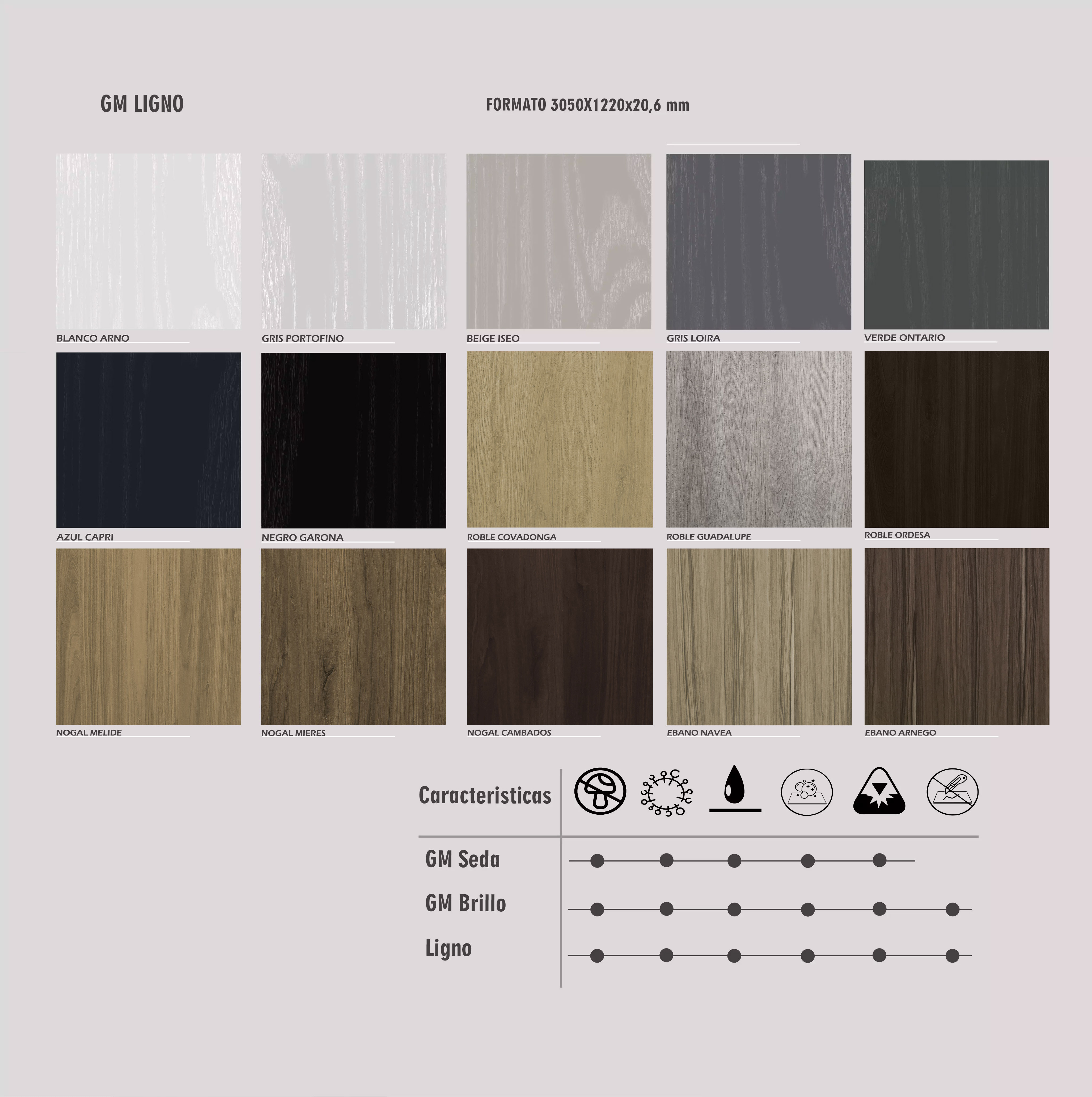 Con una paleta de 15 acabados únicos, GM Ligno ofrece desde los tonos más claros y serenos, ideales para espacios luminosos y minimalistas, hasta los más oscuros y profundos, perfectos para ambientes que buscan transmitir fuerza y carácter.