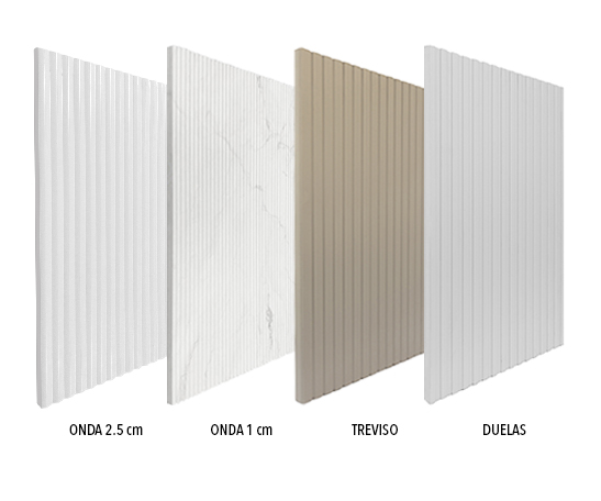 Los nuevos diseños sorprenden por su sofisticada y elegante textura. Las líneas verticales es una de las tendencias que se está incorporando a todos los muebles y estancias, incluidas la cocina, armarios y baño. Los modelos Duelas,Varese, Ondas 1 y Ondas 2,5 llegan con personalidad y se adaptan a los diferentes estilos, aportando un encanto especial. Todas ellas pueden realizarse en los diferentes colores de laca como en cualquier folio laminado.